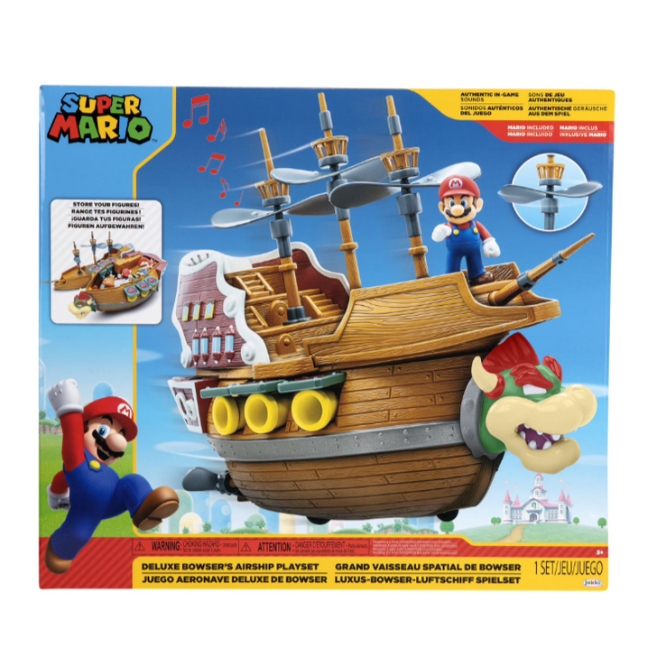 Nintendo Super Mario Deluxe Bowser's Airship is a propeller driven fortress created to bring your Super Mario™ playset dreams to life. Equipped with cannons, rotating propeller masts, wheels, and authentic in-game sounds, the Airship includes a two and a half inch Mario figure poised for victory. Roll the airship to activate spinning propellers and open the ship to store all your figures! Press the button to activate in-game sound effects. Mario must conquer the Airship to stop the invasion of the Mushroom Kingdom. It's up to you, Mario and his friends to defeat Bowser. This playset works with most two and a half inch figures. 2 x AAA batteries required (not included). Suggested for kids age 3 or older.